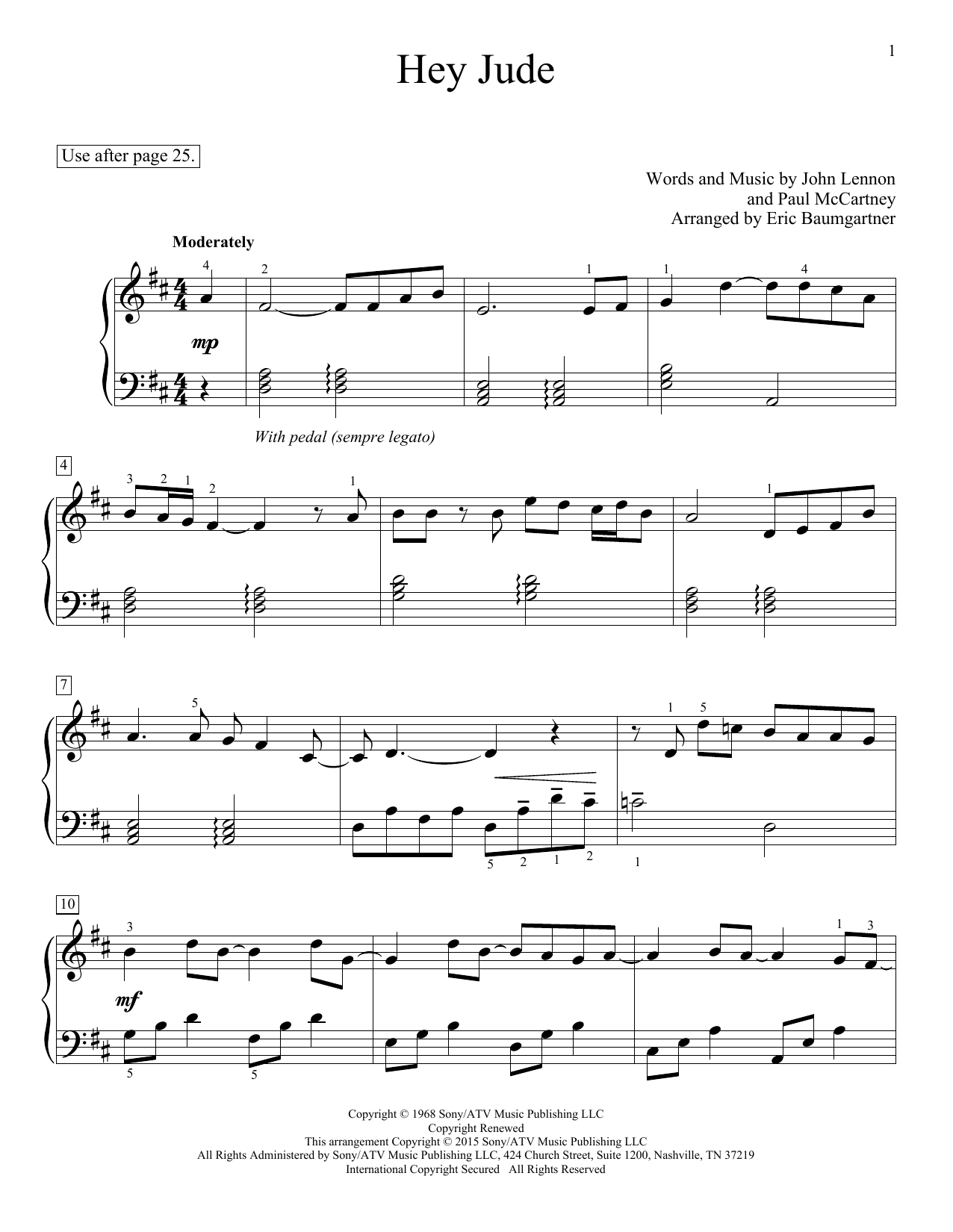 Download or print The Beatles Hey Jude (arr. Eric Baumgartner) sheet music, chords and digital score arranged for Educational Piano. This Oldies score includes 3 page(s).