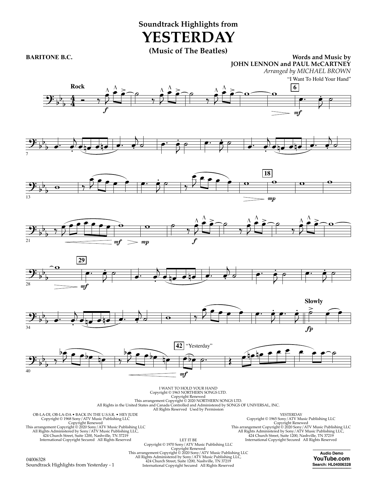 Download or print The Beatles Highlights from Yesterday (Music Of The Beatles) (arr. Michael Brown) - Baritone B.C. sheet music, chords and digital score arranged for Concert Band. This Pop score includes 3 page(s).