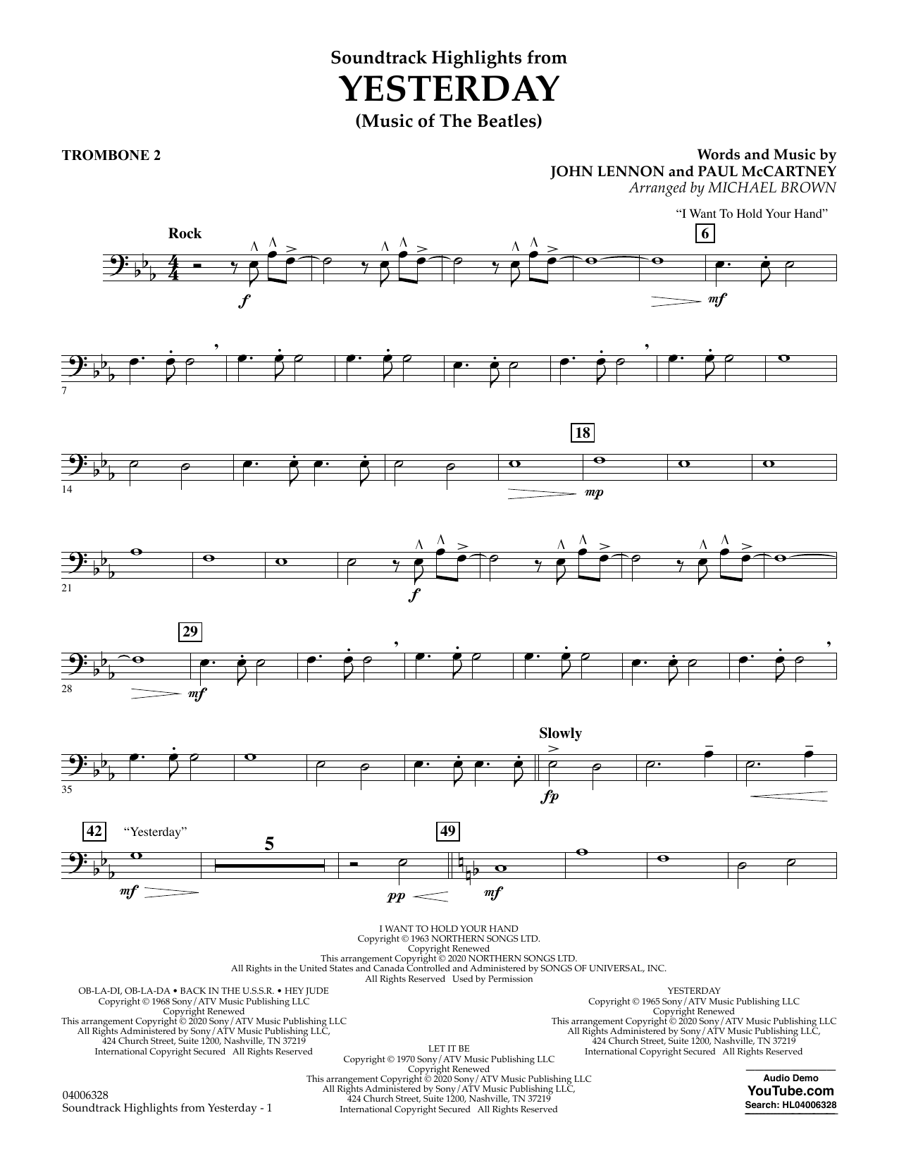 Download or print The Beatles Highlights from Yesterday (Music Of The Beatles) (arr. Michael Brown) - Trombone 2 sheet music, chords and digital score arranged for Concert Band. This Pop score includes 3 page(s).