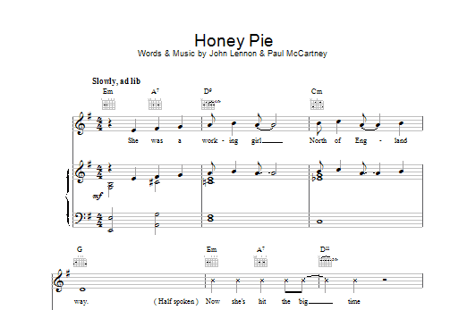 Download or print The Beatles Honey Pie sheet music, chords and digital score arranged for Easy Guitar. This Pop score includes 2 page(s).