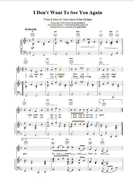 Download or print Peter and Gordon I Don't Want To See You Again sheet music, chords and digital score arranged for Lead Sheet / Fake Book. This Pop score includes 2 page(s).