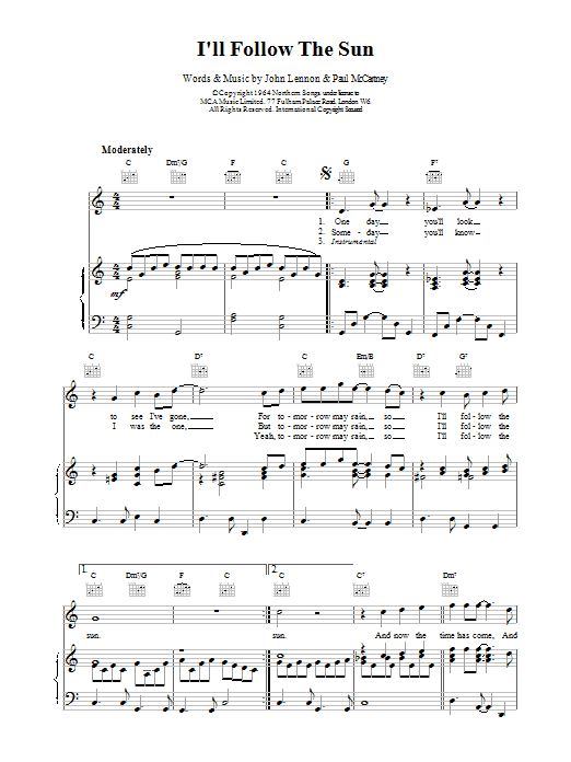 Download or print The Beatles I'll Follow The Sun sheet music, chords and digital score arranged for Piano Solo. This Pop score includes 5 page(s).