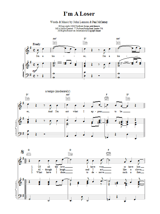 Download or print The Beatles I'm A Loser sheet music, chords and digital score arranged for Easy Piano. This Rock score includes 2 page(s).