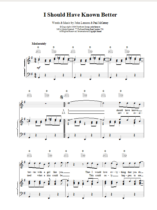 Download or print The Beatles I Should Have Known Better sheet music, chords and digital score arranged for Guitar Tab. This Pop score includes 5 page(s).