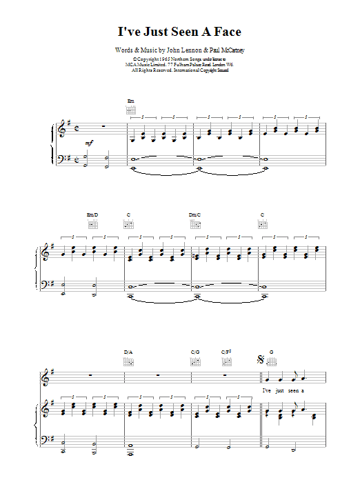 Download or print The Beatles I've Just Seen A Face sheet music, chords and digital score arranged for Trumpet Solo. This Pop score includes 1 page(s).