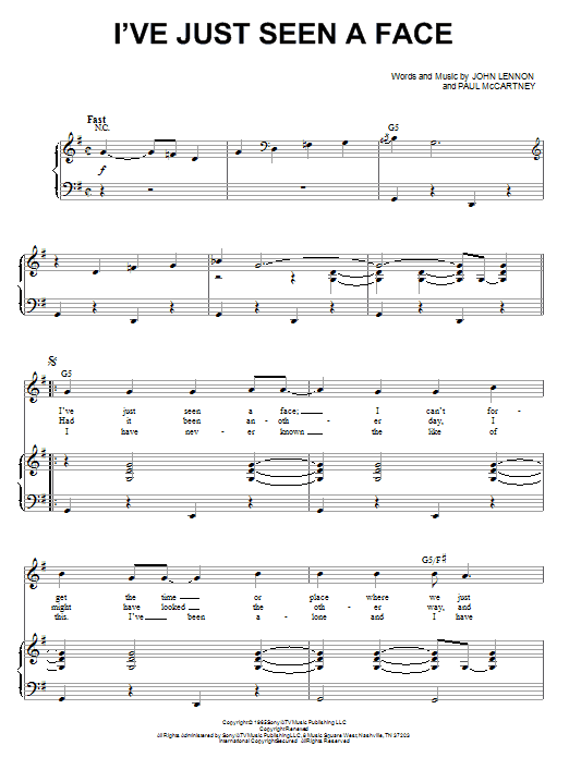Download or print The Beatles I've Just Seen A Face (from Across The Universe) sheet music, chords and digital score arranged for Piano & Vocal. This Film/TV score includes 5 page(s).