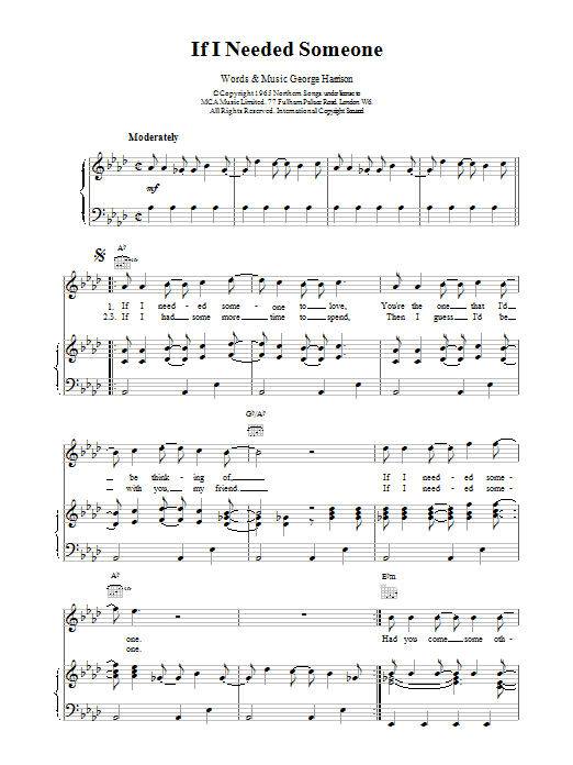 Download or print The Beatles If I Needed Someone sheet music, chords and digital score arranged for Easy Lead Sheet / Fake Book. This Pop score includes 2 page(s).