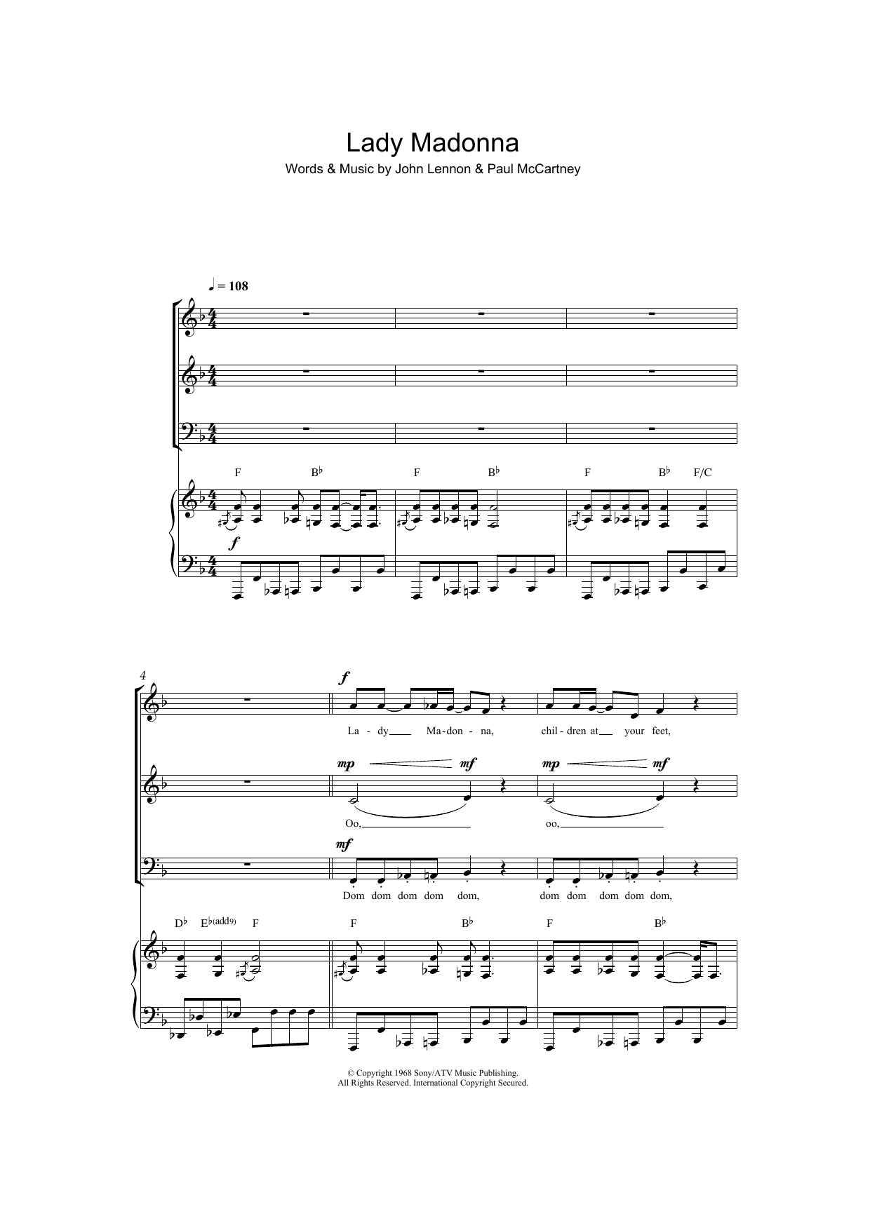 Download or print The Beatles Lady Madonna (arr. Jeremy Birchall) sheet music, chords and digital score arranged for SAB Choir. This Pop score includes 14 page(s).