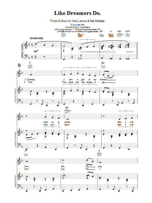 Download or print The Beatles Like Dreamers Do sheet music, chords and digital score arranged for Guitar Chords/Lyrics. This Rock score includes 4 page(s).