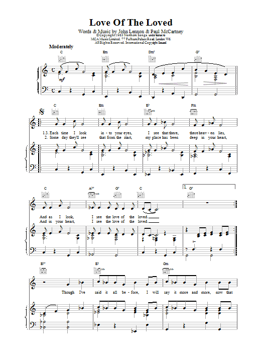 Download or print The Beatles Love Of The Loved sheet music, chords and digital score arranged for Piano, Vocal & Guitar Chords. This Pop score includes 2 page(s).