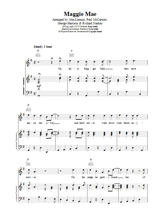 Download or print The Beatles Maggie Mae sheet music, chords and digital score arranged for Piano, Vocal & Guitar Chords (Right-Hand Melody). This Pop score includes 2 page(s).