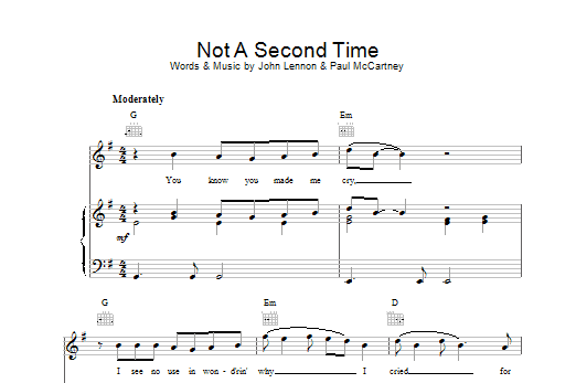Download or print The Beatles Not A Second Time sheet music, chords and digital score arranged for Piano, Vocal & Guitar Chords (Right-Hand Melody). This Pop score includes 3 page(s).