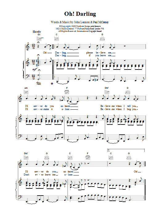 Download or print The Beatles Oh Darling sheet music, chords and digital score arranged for Piano, Vocal & Guitar Chords. This Pop score includes 3 page(s).