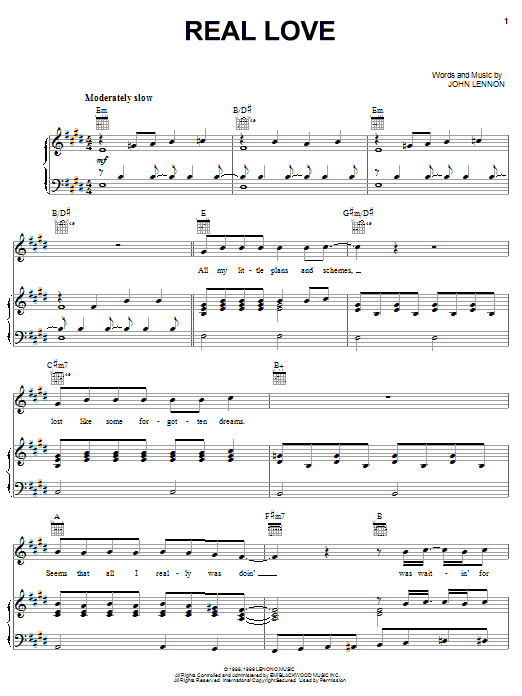 Download or print The Beatles Real Love sheet music, chords and digital score arranged for Piano, Vocal & Guitar Chords (Right-Hand Melody). This Love score includes 4 page(s).