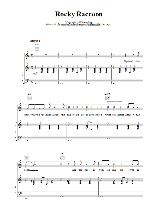 Download or print The Beatles Rocky Raccoon sheet music, chords and digital score arranged for Guitar Tab (Single Guitar). This Pop score includes 9 page(s).