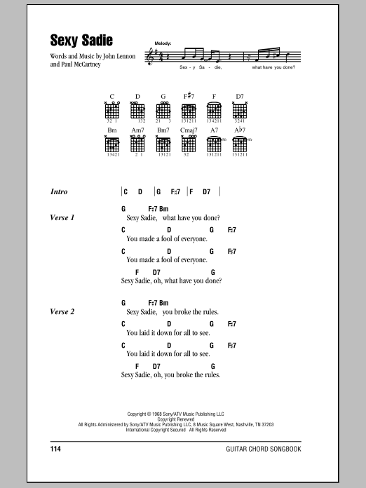 Download or print The Beatles Sexy Sadie sheet music, chords and digital score arranged for Piano, Vocal & Guitar Chords. This Pop score includes 3 page(s).