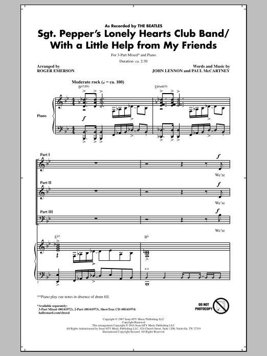 Download or print Roger Emerson Sgt. Pepper's Lonely Hearts Club Band sheet music, chords and digital score arranged for 3-Part Mixed Choir. This Pop score includes 9 page(s).