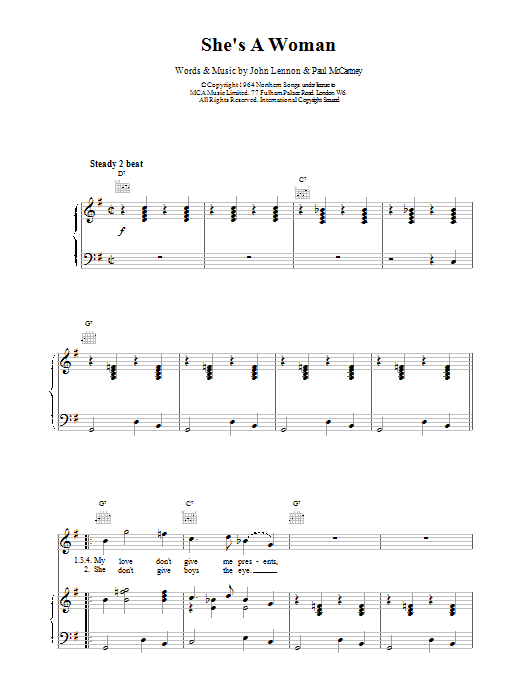 Download or print The Beatles She's A Woman sheet music, chords and digital score arranged for Guitar Chords/Lyrics. This Rock score includes 2 page(s).