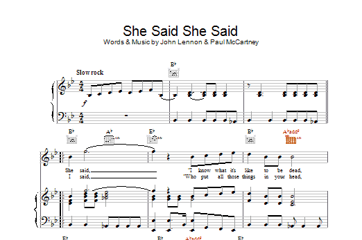 Download or print The Beatles She Said She Said sheet music, chords and digital score arranged for Piano, Vocal & Guitar Chords (Right-Hand Melody). This Pop score includes 4 page(s).
