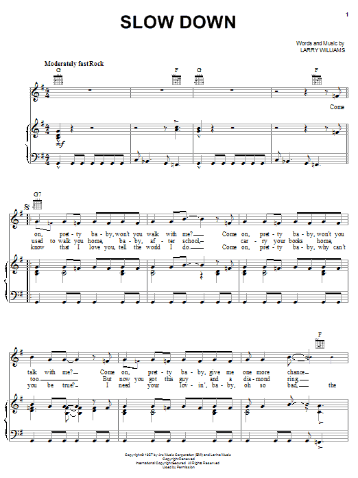 Download or print The Beatles Slow Down sheet music, chords and digital score arranged for Piano, Vocal & Guitar Chords (Right-Hand Melody). This Pop score includes 3 page(s).
