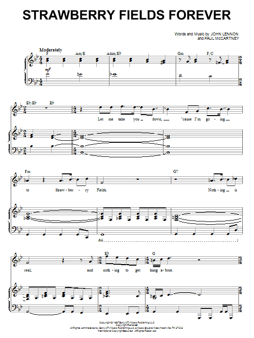 Download or print The Beatles Strawberry Fields Forever (from Across The Universe) sheet music, chords and digital score arranged for Piano & Vocal. This Film/TV score includes 7 page(s).