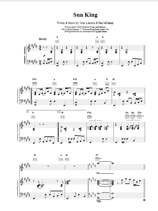 Download or print The Beatles Sun King sheet music, chords and digital score arranged for Guitar Tab. This Pop score includes 4 page(s).