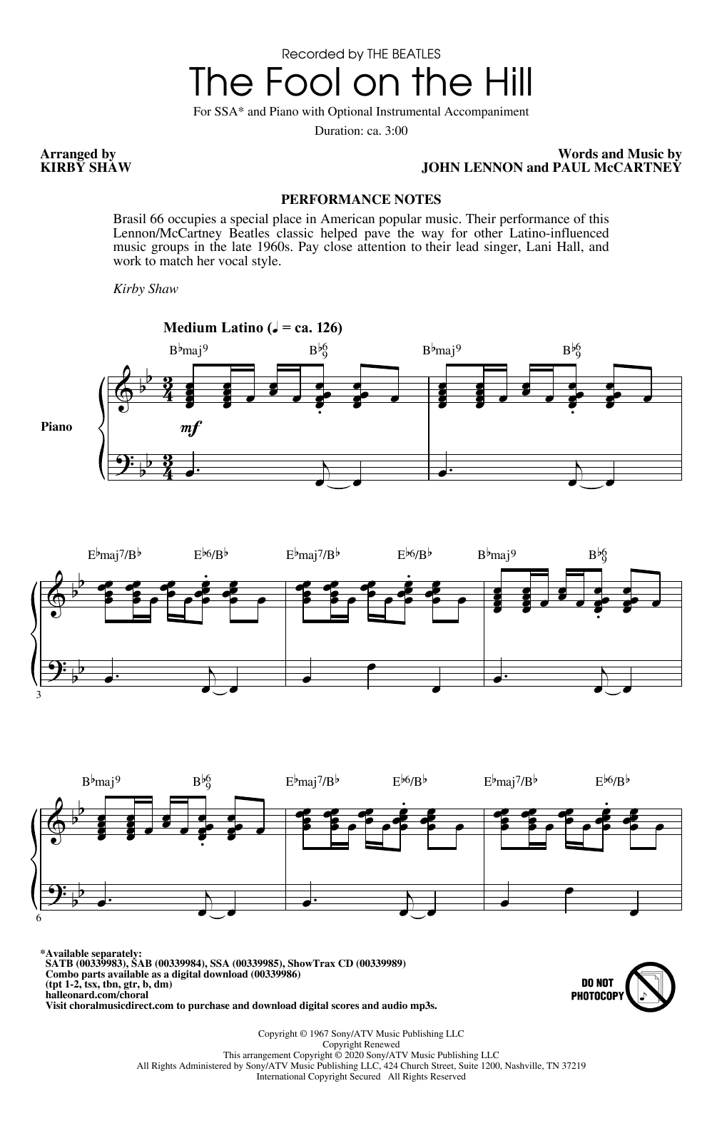 Download or print The Beatles The Fool On The Hill (arr. Kirby Shaw) sheet music, chords and digital score arranged for SAB Choir. This Pop score includes 10 page(s).