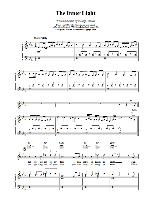 Download or print The Beatles The Inner Light sheet music, chords and digital score arranged for Piano, Vocal & Guitar Chords. This Pop score includes 3 page(s).