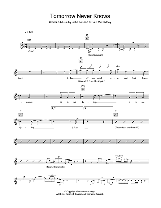 Download or print The Beatles Tomorrow Never Knows sheet music, chords and digital score arranged for Piano, Vocal & Guitar Chords. This Pop score includes 3 page(s).