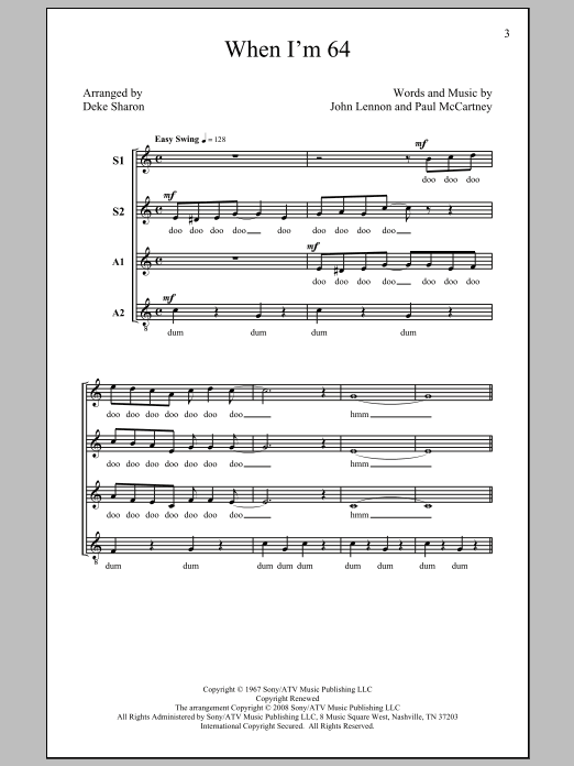 Download or print Deke Sharon When I'm Sixty-Four sheet music, chords and digital score arranged for SSA Choir. This A Cappella score includes 8 page(s).