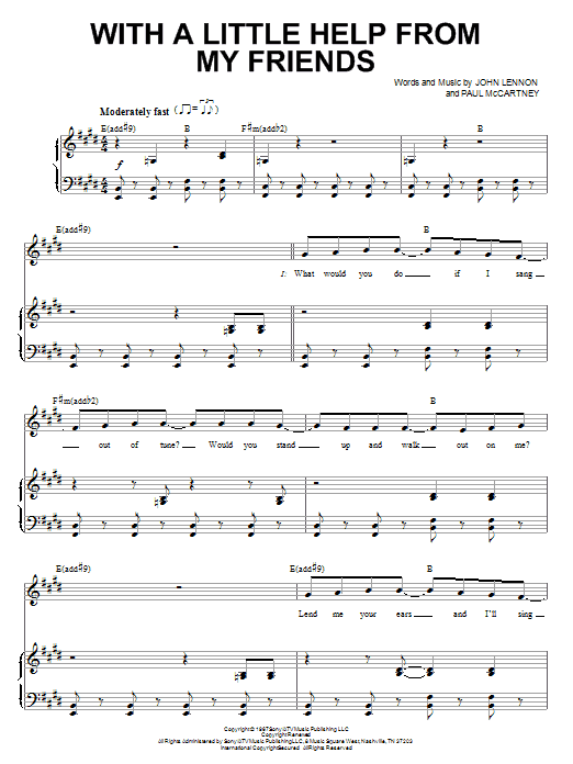 Download or print The Beatles With A Little Help From My Friends (from Across The Universe) sheet music, chords and digital score arranged for Piano & Vocal. This Film/TV score includes 9 page(s).