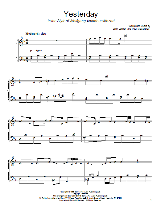 Download or print The Beatles Yesterday (in the style of Wolfgang Amadeus Mozart) sheet music, chords and digital score arranged for Piano Solo. This Classical score includes 3 page(s).