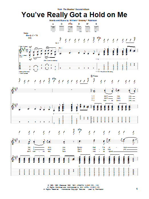 Download or print The Beatles You've Really Got A Hold On Me sheet music, chords and digital score arranged for Guitar Tab. This Love score includes 4 page(s).