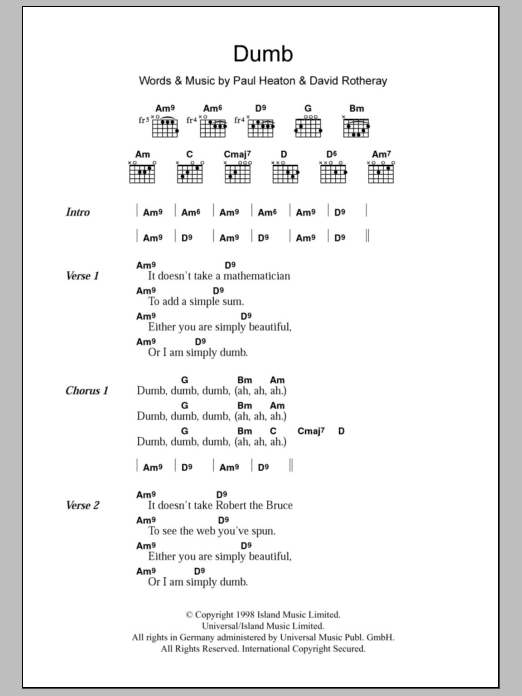 Download or print The Beautiful South Dumb sheet music, chords and digital score arranged for Guitar Chords/Lyrics. This Pop score includes 2 page(s).
