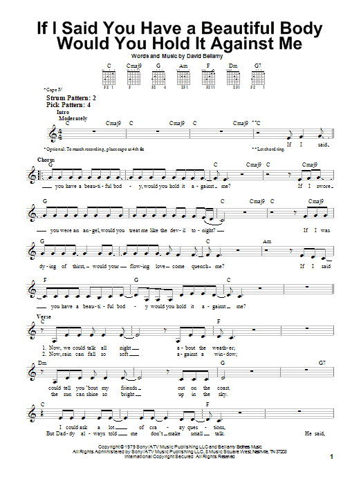 Download or print Bellamy Brothers If I Said You Have A Beautiful Body Would You Hold It Against Me sheet music, chords and digital score arranged for Piano, Vocal & Guitar Chords (Right-Hand Melody). This Country score includes 3 page(s).