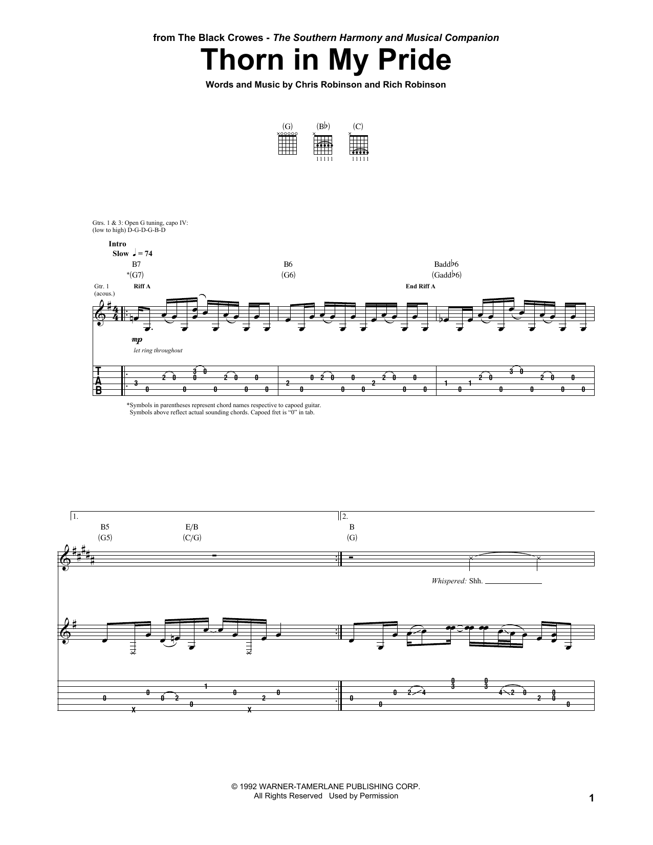 Download or print The Black Crowes Thorn In My Pride sheet music, chords and digital score arranged for Guitar Tab. This Folk score includes 18 page(s).