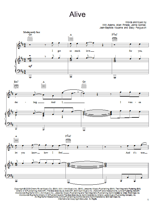 Download or print The Black Eyed Peas Alive sheet music, chords and digital score arranged for Piano, Vocal & Guitar Chords (Right-Hand Melody). This Hip-Hop score includes 11 page(s).