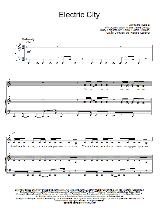 Download or print The Black Eyed Peas Electric City sheet music, chords and digital score arranged for Piano, Vocal & Guitar Chords (Right-Hand Melody). This Hip-Hop score includes 8 page(s).