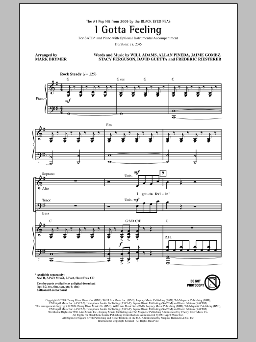 Download or print The Black Eyed Peas I Gotta Feeling (arr. Mark Brymer) sheet music, chords and digital score arranged for 3-Part Mixed Choir. This Pop score includes 11 page(s).