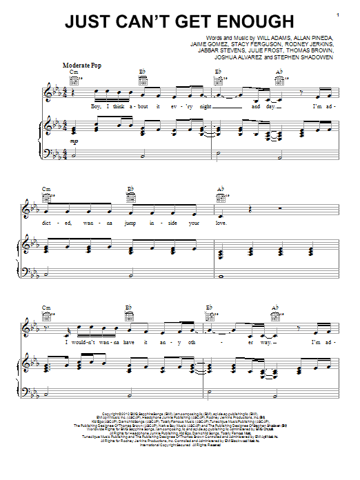 Download or print The Black Eyed Peas Just Can't Get Enough sheet music, chords and digital score arranged for Piano, Vocal & Guitar Chords (Right-Hand Melody). This Hip-Hop score includes 8 page(s).