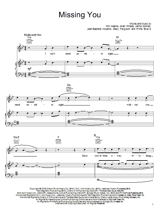 Download or print The Black Eyed Peas Missing You sheet music, chords and digital score arranged for Piano, Vocal & Guitar Chords (Right-Hand Melody). This Hip-Hop score includes 12 page(s).