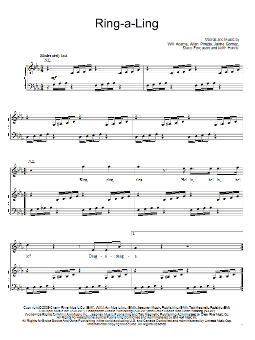 Download or print The Black Eyed Peas Ring-A-Ling sheet music, chords and digital score arranged for Piano, Vocal & Guitar Chords (Right-Hand Melody). This Hip-Hop score includes 13 page(s).