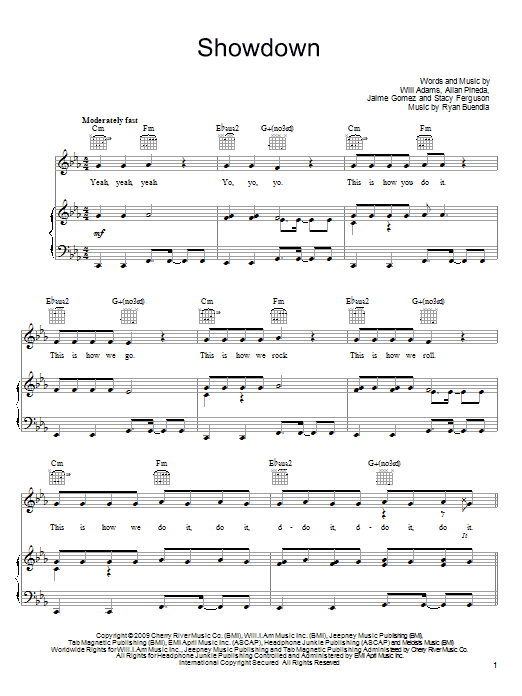 Download or print The Black Eyed Peas Showdown sheet music, chords and digital score arranged for Piano, Vocal & Guitar Chords (Right-Hand Melody). This Hip-Hop score includes 8 page(s).