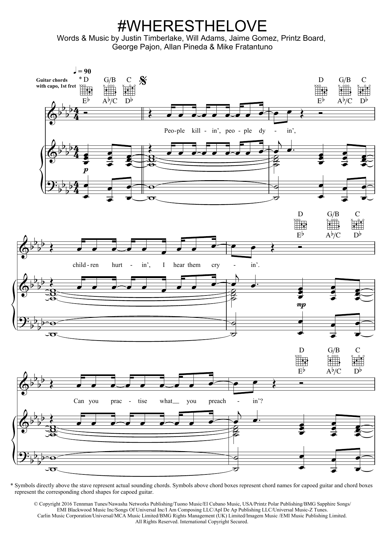 Download or print The Black Eyed Peas #WHERESTHELOVE (featuring The World) sheet music, chords and digital score arranged for Piano, Vocal & Guitar Chords. This Hip-Hop score includes 13 page(s).