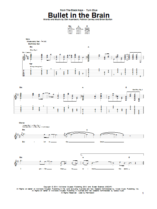 Download or print The Black Keys Bullet In The Brain sheet music, chords and digital score arranged for Guitar Tab. This Pop score includes 6 page(s).