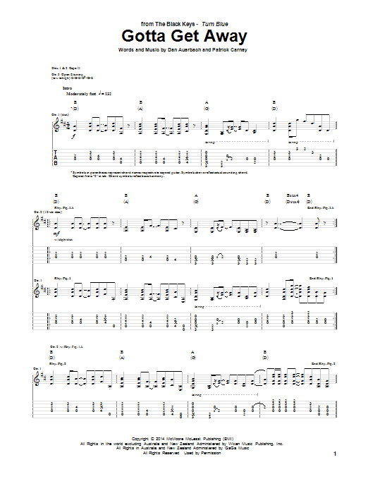 Download or print The Black Keys Gotta Get Away sheet music, chords and digital score arranged for Guitar Tab. This Pop score includes 6 page(s).