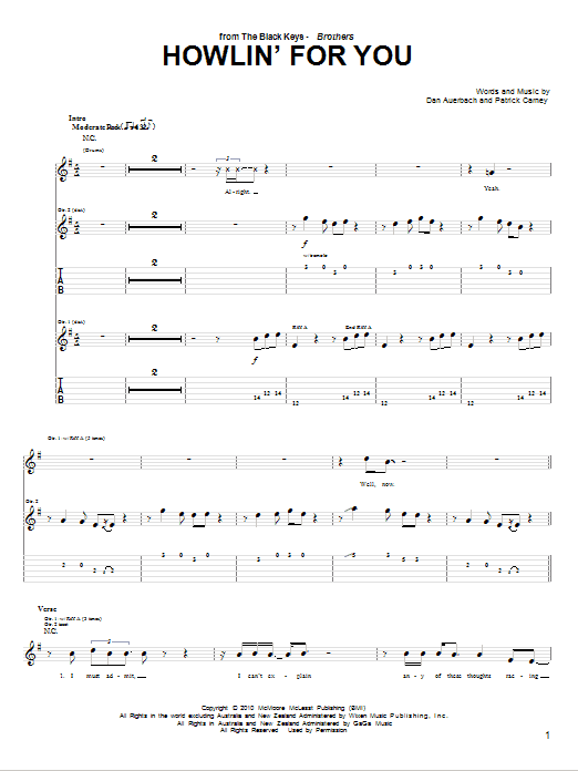 Download or print The Black Keys Howlin' For You sheet music, chords and digital score arranged for Piano, Vocal & Guitar Chords (Right-Hand Melody). This Blues score includes 5 page(s).