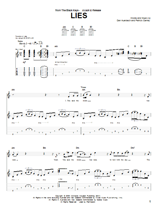 Download or print The Black Keys Lies sheet music, chords and digital score arranged for Guitar Tab. This Pop score includes 6 page(s).