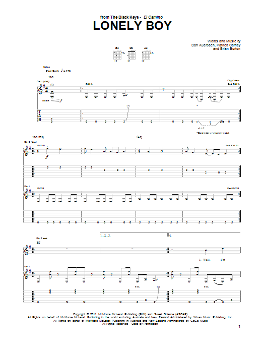 Download or print The Black Keys Lonely Boy sheet music, chords and digital score arranged for Guitar Tab. This Blues score includes 3 page(s).