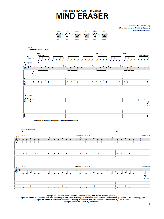 Download or print The Black Keys Mind Eraser sheet music, chords and digital score arranged for Guitar Tab. This Blues score includes 6 page(s).